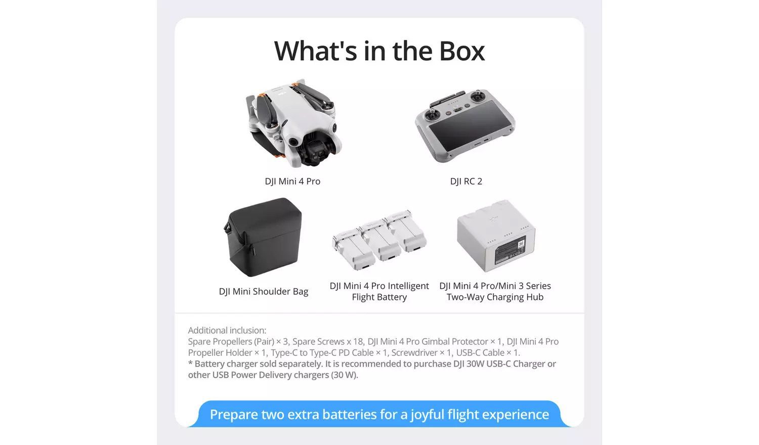 This version of the Mini 4 Pro includes the Fly More Combo group of accessories, which are meant to better equip you for a long day of aerial filming. The Fly More Combo includes two additional intelligent flight batteries, providing you with up to 68 additional minutes of flight time, a two-way charging hub to help you recharge your batteries quickly, and a shoulder bag to carry your gear to your shooting location.